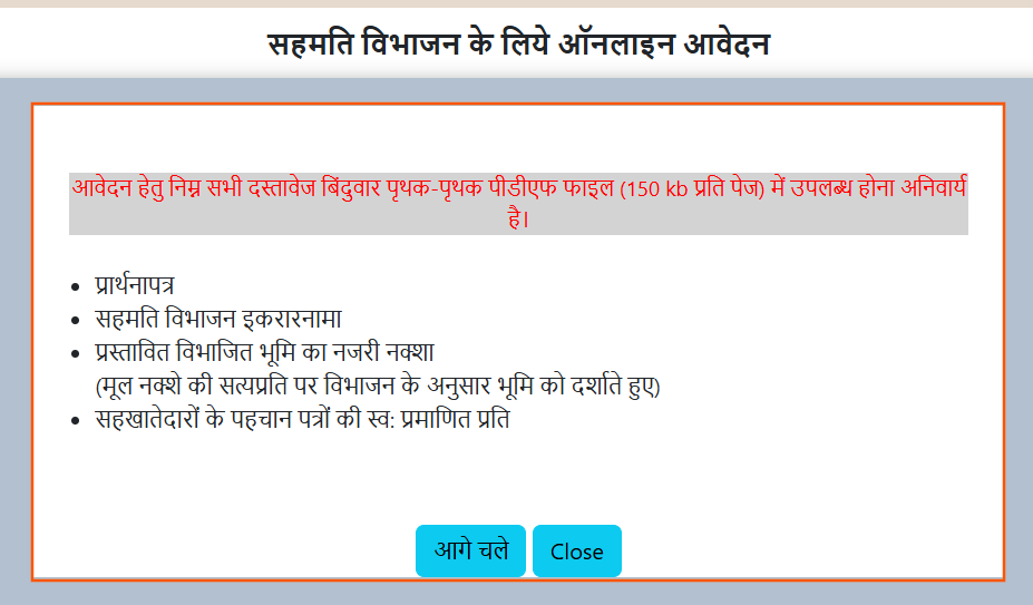 उसके बाद निर्देश पढ़ ले सहमति विभाजन आवेदन करने से पहले 150 KB पीडीएफ फाइल साइज में निम्नलिखित दस्तावेज को अपलोड करना होगा जानकारी पढ़ने के बाद आगे बढ़े बटन पर क्लिक करें